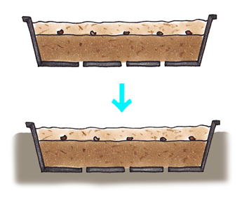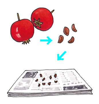 タネまきは、10〜11月に熟した果実を採取し、水で洗って果肉を完全に取り除き、タネだけにします。タネは乾かすると発芽能力がなくなるので、5号(直径15cm)の平鉢に入れた赤玉土小粒などにすぐまいて、1cmほどの厚みで土をかぶせます。戸外に置き、乾かさないように管理すれば春に発芽します。なお、鉢は縁まで土に埋めておくと、乾きすぎを防ぐことができます。