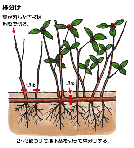さし木は3〜4月の新芽が伸びる前に行ないましょう。2〜3節の長さでさし穂を取り、30分ほど水揚げをします。切り口に植物成長調整剤「ルートン」を薄くまぶしてからさし木用土にさし、風の当たらない日陰で乾かさないように管理します。約3ヶ月で発根します。