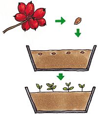 ハナミズキやヤマボウシは、普通接ぎ木でふやしますが、台木の準備などが必要なので、一般家庭では通常行われません。しかしながら、タネでふやすことができます。野生種では、親と同じものを大量にふやすことができます。園芸品種の場合は、親と同じものはでませんが、自分だけのオリジナルの品種をつくることができます。9~10月に赤く熟した果実を採種し、果皮と果肉を水洗いしてきれいに取り除き、赤玉土を入れた平鉢にまきます。タネは乾燥すると発芽しないので、すぐにまきましょう。春に発芽したら、本葉3~4枚のころに2.5~3号(直径7.5~9cm)鉢に1本ずつ植え替えます。