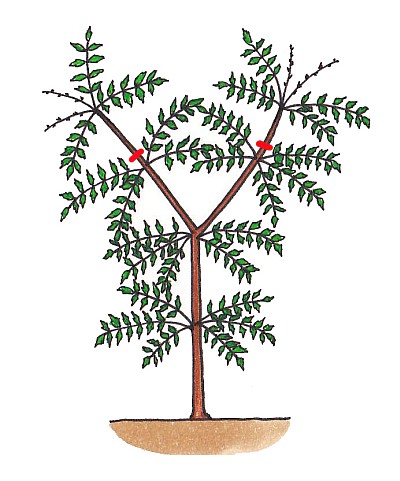 さし木は6~7月に、成熟した枝を10cmほどの長さで切ります。複葉で葉数が多いので、基部の小葉を数枚残して取り除きます。30分ほど水揚げをして、切り口に植物成長調整剤「ルートン」を薄くまぶしてから、赤玉土の小粒やさし木用土を満たした鉢か箱にさします。たっぷりと水やりして日陰に置き、秋に鉢上げします。