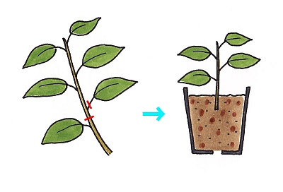 さし木で容易にふやせます。枝の切り口から乳白色の樹液が出るので、よく洗い流しておき、植物成長調整剤「ルートン」を薄くまぶしてからさしましょう。最適期は5月~7月で、1カ月半~2カ月で鉢上げできます。