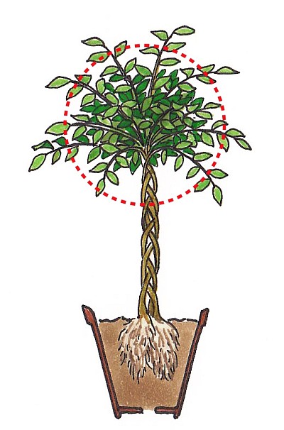 スタンダード仕立てなどに仕立てられた株は、伸びてきた枝を定期的に刈り込んで、樹形を維持します。刈り込む際に切り口から樹液が垂れるので、戸外で行なうか、床に新聞紙などを敷いてから作業しましょう。