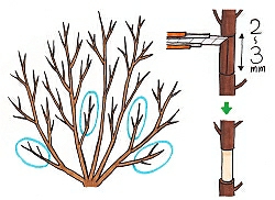 枝数がそう多くなく、枝振りも観賞の対象になるため、極度な剪定は控えます。樹形を整える場合は、花後の1~2月に樹形を見ながら、伸びすぎた枝を剪定します。この時に、枯れ枝や重なった枝、地面に対して垂直に伸びる強い枝も切り除きます。作業が遅れると花が咲きにくくなります。また、園芸品種は接ぎ木でふやされている株が多いため、台木からひこばえが出ることがあります。見つけしだい、つけ根から切り除きます。