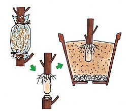 3月に直径1cm程の新しい枝を選んで、表皮をはぎ取り、湿らせた水ゴケを巻き、乾燥しないようにビニールシートで包みます。9月に根が出た部分から枝を切り取り、鉢上げします。当分の間は直射日光が当たらない半日陰で管理します。