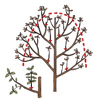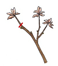 成木になると自然に整った樹形となるので、基本的に剪定は必要ありませんが、小さくしたい時には、開花後、新葉が出る前に剪定します。また、伸びすぎた枝や込み合った枝は、基部から2~3芽を残して、外側に向いている芽の上で切り除きます。枯れ枝や、枝の途中から出て真上に勢いよく伸びる徒長枝は、落葉期に基部から切り除きます。