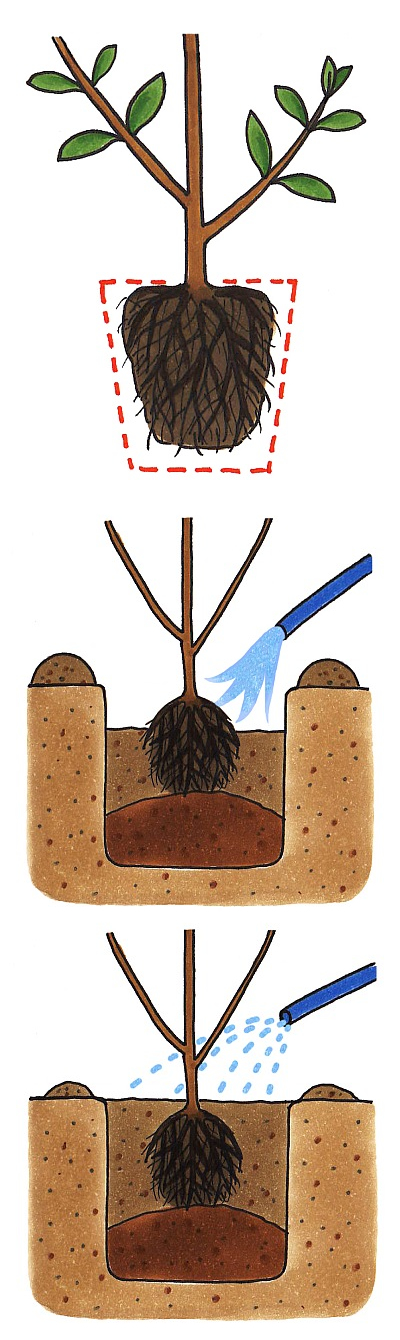 2月中旬~3月、または10~11月までが植えつけの適期です。根鉢の周囲の土をくずして根を出し、根鉢より一回り大きな植え穴を掘り、掘り上げた土に腐葉土や少量の完熟堆肥などを混合して植えつけます。根鉢の周りに十分水を注ぎ、棒などで突いて根と植え土をなじませます。秋に植えつけるときは、地際で枝を切ってもかまいません。