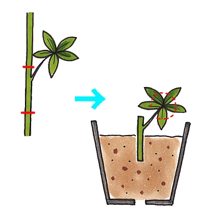 さし芽でふやすことができます。5~6月と8月下旬~9月に、1~2節つけたつるを切り、茎の切り口に植物成長調整剤「ルートン」を薄くまぶしてから水はけのよい土にさすと、容易に発根します。(イラストの赤線でカットします。大きな葉は少し切ってから挿します。)また、寒さで地上部が枯れる前に、つるを切り、室内で水ざしすることもできます。