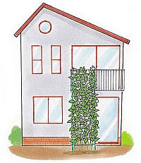 本葉が7、8枚展開したときに摘心を行ない、支柱とつるもの用ネットを準備します。つるは4m以上伸びるので、2階建ての家であれば、2階のベランダまで伸ばしてみましょう。ネットの両端には丈夫な支柱や金属パイプを通し、しっかり固定しておきます。