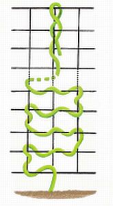 また、つるはぐんぐん伸びていくのですが、開花は比較的遅く、真夏になってから。生育初期のうちはネットの下の方を、ジグザクに横方向にも誘引し、ネットの頂部までつるが届いたら折り返し、下の段へ誘引すれば、つるの上の方にだけ花が固まって咲くのを防ぐことができます。
