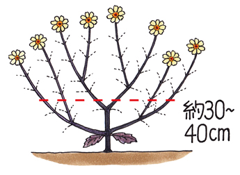 一般的なダリアと同様に、ガーデンダリアも高温多湿が苦手で、夏は株が弱りやすくなります。初夏から咲いた花がらはその都度切り、初夏の花が咲き終わったら、8月上旬ごろ、株元から30〜40cmの高さで切り戻しましょう。コンパクトにすることでエネルギーの消耗が抑えられ、夏越ししやすくなり、秋に再び整った姿で花を楽しむことができます。