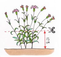 ダイアンサスの仲間は、高温が苦手です。高温期に入る前の梅雨の間に、切り戻しを行ないます。草丈15cmぐらいの位置で短く切り戻しましょう。このとき、必ず下葉が多数あることを確認してから、切り戻します。下葉が少ないと、光合成してもあまり栄養をつくることができず、枯死に至ることがあるので、注意しましょう。切り戻し後、新芽が吹いた状態で夏を乗り越えられれば、秋には美しい花を再び咲かせてくれます。