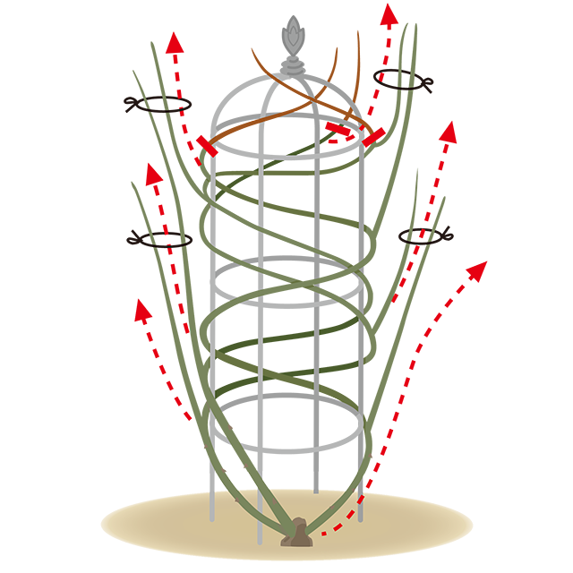 [8〜9月]初秋のころからつるバラは、再び枝をぐんぐん伸ばします。どんな仕立て方であっても、枝垂れた枝は、上向きに伸びるように誘引します。また、必要以上に枝が伸びる場合は、随時切り戻しても大丈夫です。