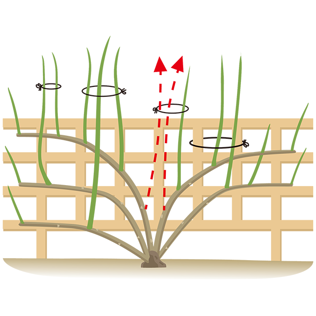 ②咲かせたい場所に、枝を水平、もしくは放射状に誘引します。