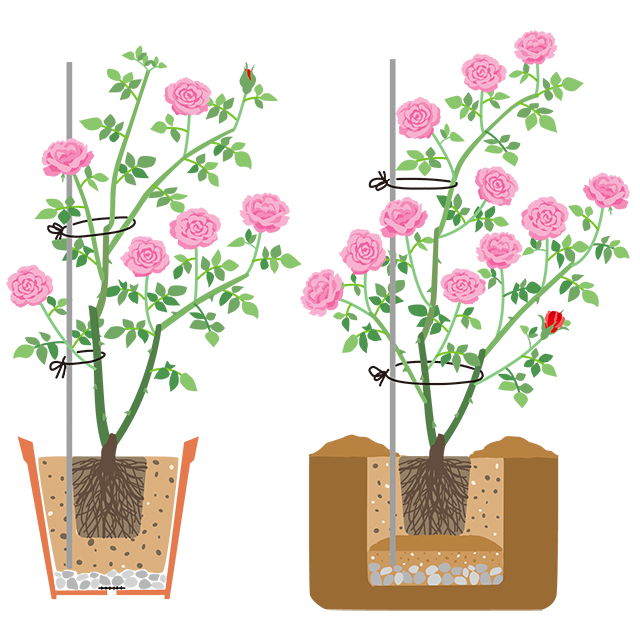 植えつける前に土を落とした苗を、規定倍率に希釈した活力剤(「マイローズばらの活力剤」など)に1時間程度つけておくと、芽吹きがよくなります。また、地植えも鉢植えも植え付け後は支柱を立て、枝をしっかりとめましょう。