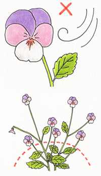 ビオラには、開花後に伸び上がる性質をもつ品種があります。草姿が乱れてきたら、思い切って切り戻してあげましょう。コンパクトにまとまった姿で、もう一度花が楽しめます。