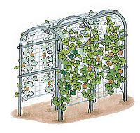 アーチ支柱と、まっすぐな1本支柱を渡してしっかり固定します。アーチ支柱同士の頂上部も1本支柱でつなぎ、ぐらつかないようにします。さらに、つるもの用ネットを張っておくと安心です。