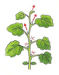 親づる(主茎)と2本の子づる(わき芽)を伸ばし、ほかのわき芽は取り除いて整枝します。また、1週間に1回、伸びたつるを支柱に誘引しましょう。