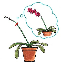 もう1回開花させたいときは、花茎の下から3節目の上で切ります。ただし、1年に2回開花させると、株が極端に傷むこともあります。葉が垂れていたり、しわが寄ったり、ふやけたような場合は株が傷んでいるので、2番花は諦めて、花茎の基部で切り取ります。