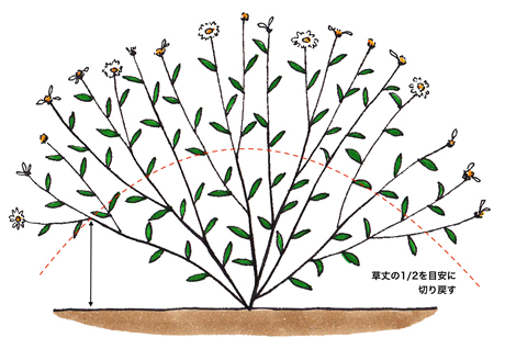 春から秋にかけて繰り返し開花し、長期間楽しめます。旺盛に成長して株が乱れがちになるので、全体の花が咲き終わったら、草丈の半分ほどを目安にドーム状に1回切り戻すと、整った姿で再び開花します。姿が整うだけでなく、コンパクトになり、夏の蒸れ防止にもなります。切り戻しは春から秋にかけて、繰り返し行ないましょう。