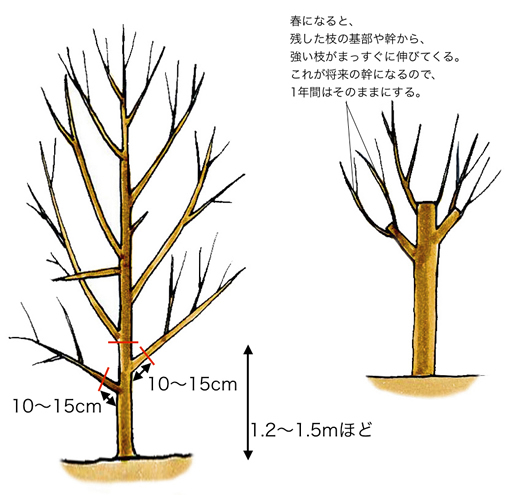 成長するにしたがって、樹形が三角錐形になっていくので、基本的には枯れ枝を切り除く以外に剪定は不要です。 株全体を小さくするための強剪定は、冬の間に行ないます。適期は11〜2月です。地面から1.2〜1.5mほどの高さで幹を切り詰めます。下に枝があれば、幹からの長さを10〜15cm程度を残し、先端をばっさりと剪定します。幹や太い枝を切りときは、のこぎりを使いましょう。 春には、残した枝の基部や幹から、直接、強い枝がまっすぐに伸びてきます。これが将来の幹になります。1年間はそのままにして、2年目に幹にする枝を3本ほど残し、それ以外を基部から切り除きます。そのまますべての枝を伸ばすと枝が細く、樹形も悪くなってしまいます。幹や太い枝を切った時には、細菌が侵入して腐ることがありますので、癒合剤を塗ります。