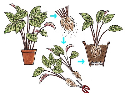 温度と湿度の高い梅雨時に、株分けでふやします。根鉢を鉢から取り出し、葉を数枚つけて2つか3つに株分けします。腐った根や、弱々しい茎は取り除き、元気のよい新芽を残すようにして、新しい培養土で植えつけます。株分け後、2週間程度は日陰に置いて養生し、徐々に明るい場所に移動させます。
