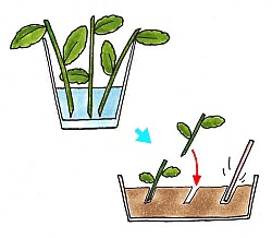 さし木の適期は初夏です。茎を2節ごとに切り取り、切り口を水に30分程度浸けてから、さし穂をさします。よりよい発根を期待するには、切り口を水に漬けた後に植物成長調整剤「ルートン」を切り口に薄くまぶしてからさします。箱や平鉢などに敷き詰めた市販のさし木用土に、割りばしなどで穴をあけてから、さし穂をさすと、さし穂の切り口が傷みません。発根までは、しっかりと水やりしましょう。さし木から2週間ほどで根が伸び始め、4週間たったら、ポリポットに植え替えます。