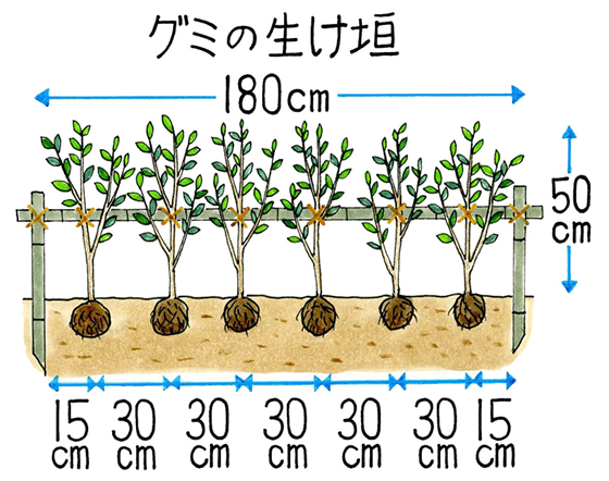 生け垣は、イラストを参考に植えつけてください。なお、グミの仲間は株元から枝が叢生し、樹高が1mほどでこんもりとした樹形になるので、奥行きは1mほど必要です。