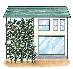 植えつけ時に、目の大きさ10cm角ぐらいのつるもの用ネットと支柱を準備します。つるは約2~3mのびるので、2階建ての家であれば2階のベランダまで伸ばしてみましょう。