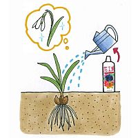球根を植えつけるときに、元肥として粒状肥料「マイガーデン花・野菜用」、「マイガーデン植物全般用」を、1m²当たり150g、植えつける場所の土に混ぜて植えつけます。鉢植えでは、用土1ℓ当たり5gの同様の肥料を、土によく混ぜて植えつけます。 花後から5月下旬までは、10日に1回程度、所定の倍率に希釈した液体肥料「マイガーデン液体肥料」、「花工場原液」を施します。この時期は来年の花を準備する時期になります。しっかりと球根を育てましょう。