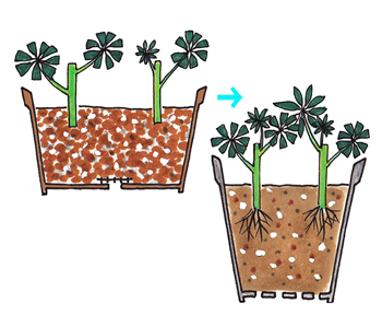 水はけのよい肥沃な用土1ℓ当たり3gの粒状肥料「マイガーデン植物全般用」を混ぜて植えつけましょう。根鉢を崩さずに鉢増しするのであれば、5~9月まで作業が可能です。鉢を大きくしたくない場合は、5~6月ごろに植え替えれば、その後の回復が順調に進みます。太い根が鉢穴から出てくると水はけが悪くなるので、そのような場合は植え替えます。