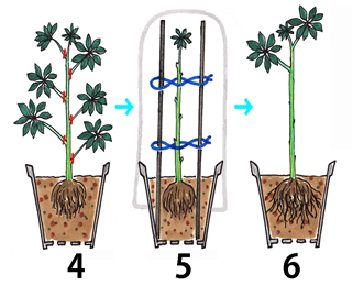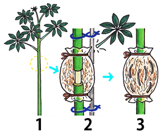 取り木は、株の上から30cmほどの位置を幅2〜3cmで環状剥離し、湿らせた水ごけで巻いてビニールシートで覆います。1〜2カ月後、発根が見えたら株から切り離します。