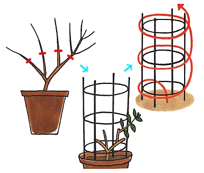 前年の夏に花芽ができるので、刈り込む場合は、開花後、なるべく早い時期に作業します。鉢植えにして行灯づくりでも楽しむことができます。つるが伸びだす前の3月下旬~4月に太い枝を2本ほど、10~15cmの長さまで切って残し、ほかは地際で切り詰め、行灯支柱を立てておきましょう。春になると新芽が伸びてつるとなるので、一定方向に下から上へ新しく伸びてきたつるを巻きつけていきます。