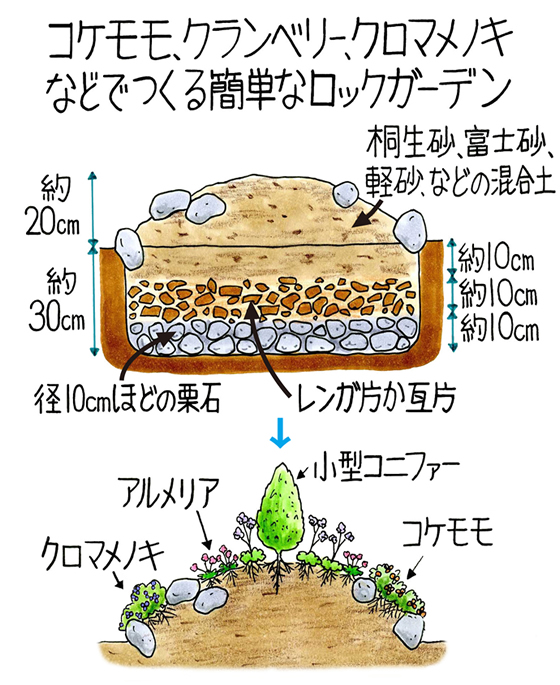 参考に、暑さに弱いブルーベリーの仲間や高山植物を本格的に育てるためのロックガーデンのつくり方をイラストで示しました。クランベリーやコケモモの栽培にも挑戦してみてください。ロックガーデンは、20cmほどの高さに盛り土をし、用土が流亡しないように、周囲を石などで囲ってつくります。クランベリー、クロマメノキ、コケモモとともに、小型のコニファーやミヤマオダマキ、アルメリアなどの高山性植物を植えるとよいでしょう。