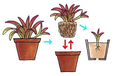 ヤシの実チップや水ごけをつかい、植え込み資材1ℓ当たり5gの粒状肥料「マイガーデン植物全般用」を混ぜて植えつけましょう。花が終わった株はしだいに枯れていくので、観賞期間が終わった株は基部から切り取り、脇に出ている子株を株分けして植え替えます。適期は5~9月上旬です。植えつけ後は1カ月ほど明るい日陰に置いて養生します。