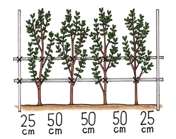- 杭の高さは、生け垣の最終的な高さより低くし、横に竹などの支柱を2〜3本を渡して、ひもなどで杭に固定します。横に渡した支柱に幹を縛って、株がぐらつかないようにします。