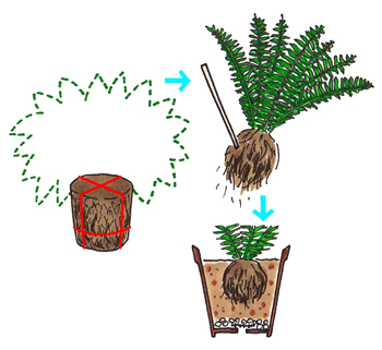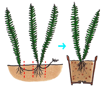5~6月ごろに株分けでふやします。株分けの方法は、鉢から根鉢を抜き、底の部分を1/3程度落としたら、3~4等分に切り分けます。傷んだ葉や、古い葉を根元で切って間引きます。赤玉土小粒5、ピートモス3、日向土か軽石2の配合土を使って元の大きさの鉢に植えつけ、明るい日陰に置いて1ヶ月ほど養生させます。