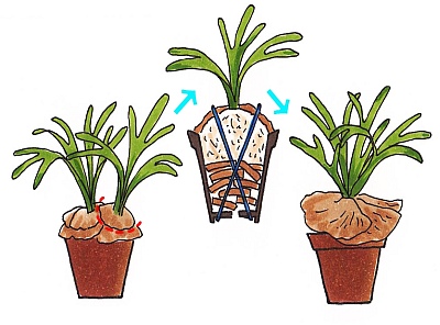 ビフルカツムやウィリンキーなど子株が出やすい種類は、株分けでふやすことができます。適期は5~7月ですが、あまり小さいうちに親株から外してしまうと、その後の成長が著しく遅れたり、枯らしたりすることもあるので、ある程度育ってから分けた方がよいでしょう。新しい外套葉が少し動き出したころや、完全に茶色く枯れたころに分けると、新芽を傷つけたり折れたりすることが無いので安心です。