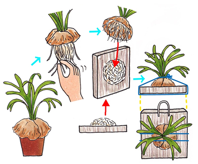 板につける場合には、まず、よく湿らせて固く絞った水ごけを板の上に適量のせ、その上に外套葉を被せるように置きます。水ごけの量が少なすぎると十分に根が張れなかったり、子株が出た際に干からびてしまったりするので注意します。目安としては、手のひらサイズの株に握りこぶし大の水ごけをつけてやるぐらいでよいでしょう。この時、成長点(胞子葉が出る部分)が板の中心に来るようにします。次に、胞子葉のすぐ下を、シュロ縄などでヘゴ板にややきつめに縛り付つます。その後、胞子葉の上の方をヘゴ板にやや軽めに縛り固定します。最後に、板の上部に穴をあけ、コーティング針金などを通して吊り下げます。このとき、板がまっすぐ吊下がるように予めバランスのよい位置を探ってから穴をあけます。