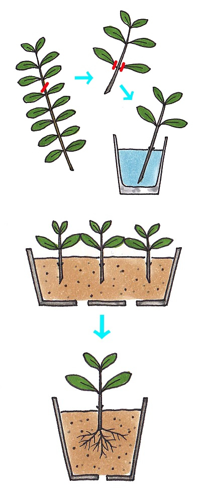 さし木は6~7月にその年に伸びて、硬くなった枝をさし穂に使います。さし穂の1番下の葉を取り除いてから1時間ほど水揚げをし、切り口に植物成長調整剤「ルートン」を薄くまぶして、鹿沼土や赤玉土の細粒やさし木用の用土にさします。乾かさないように水やりして管理すれば、秋には発根します。