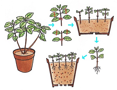 さし芽で容易にふやせます。5月中旬から8月ごろ、切った茎の切り口に植物成長調整剤「ルートン」を薄くまぶして、清潔な赤玉土小粒などに数本ずつまとめてさせば容易に発根し、すぐに観賞できる姿となります。