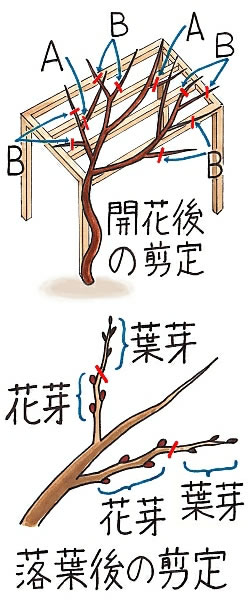 剪定は花後、5月下旬~6月下旬までに行ないます。まず、混みすぎたり、重なった不要なつる(A)を基部から剪定します。こうすることで、株の内側まで日が当たるようになり、花芽がつきやすくなります。次に、春に伸びた枝で伸びすぎたもの(B)を適当な長さに切り詰めます。