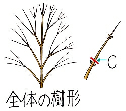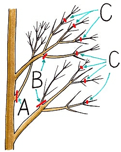 まず、樹形を考えて、地面に対して垂直に伸びて樹形を乱すような枝、枯れた枝、混みすぎた枝(A)を株元から切ります。次に、木の内側に向いて伸び、重なった枝(B)を整理します。また、樹形を小さく保つためには、枝の適当な位置で、節のすぐ上(C)から切ります。
