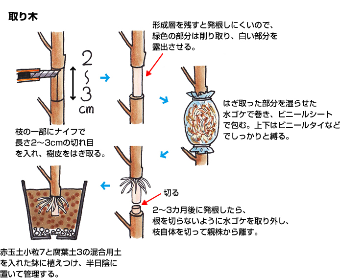 取り木は、前項目「仕立て直し」の「取り木」のイラストを参考に作業してください。