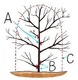 あわせて下部の枝(B)も基部から切り除きます。よく萌芽するので、刈り込む(C)こともできます。また、枝が伸びてきた後でも5月までに剪定すれば、夏に花を咲かせます。