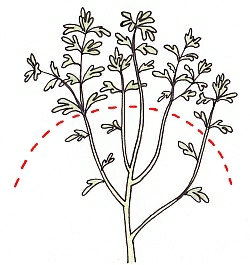 比較的、生育旺盛な植物で、徐々に草丈が高くなります。草姿のバランスが悪くなったら、下葉を数枚残し、高さ15~20cm程度の位置まで切り戻します。