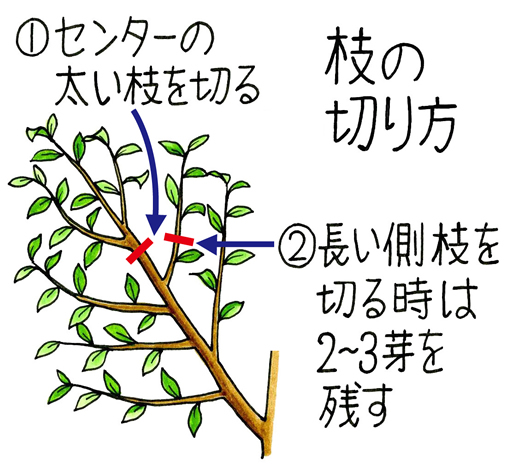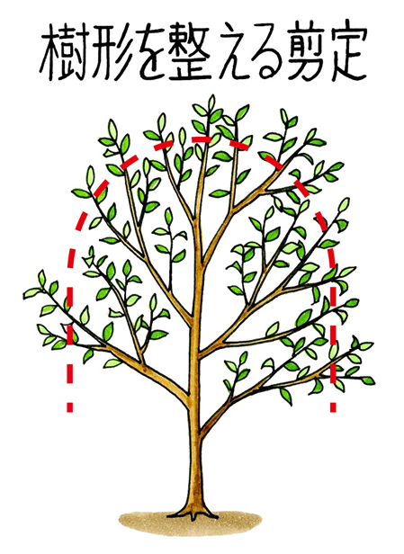 強い剪定にも耐えるので、好みの樹形に仕立てることもできます。剪定の適期は、開花後の6〜7月です。遅い時期の剪定は、花と実がつかなくなる原因になります。樹形が乱れた場合は、12月にもう一回剪定を行ないます。極端に樹形が乱れたり、仕立て直しをする場合は、寒さがゆるんで成長を始める前の3月に行ないますが、このとき強く刈り込むと、数年間は実つきが悪くなります。「枝の切り方」のイラストを参考にしてください。