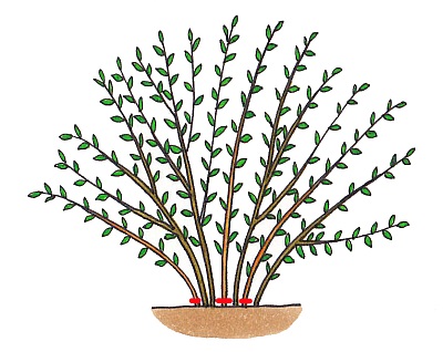 ヤマブキの枝の寿命は短く、地際から次々と新しい枝を伸ばして株を大きくしていきます。花は、その年に伸びた枝にしかつかず、古い枝からは新しい枝が出にくくなるので、落葉期には枯れ枝や古枝を基部から切り除きます。枝の途中で刈ると、枯れ込むことがあります。