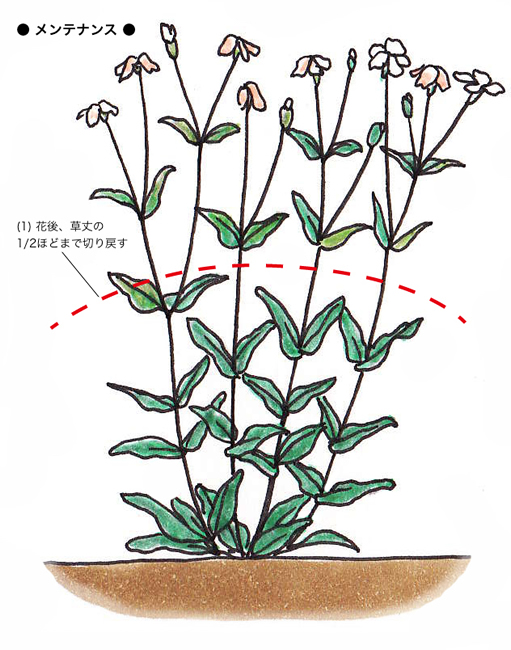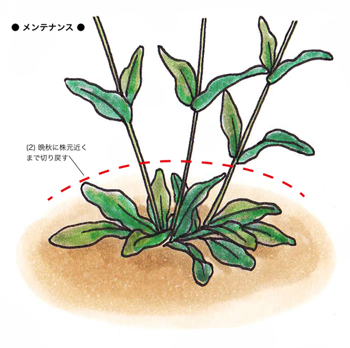 高温多湿が苦手なので、花後は蒸れを和らげるために切り戻し、風通しをよくします。続いて冬に入る前に株元近くで切り戻しておくと、ロゼット状に広がる葉を残して休眠します。
