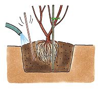 根鉢の2倍の直径、深さの植え穴を掘り、元肥として腐葉土やピートモスと、粒状肥料「マイガーデン植物全般用」1m²当たり150gを植え土に混合し、根鉢を1/3ほど崩して植えつけます。ツツジの根は地表近くに張るので、深植えは根腐れの原因となります。根鉢の上部が地面よりも10~15cmほど高くなるように土を入れ、株を据えて植えつけます。植えつけ時は水をやりながら棒でつついて、根と土をよくなじませます。
