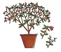 さし木で簡単にふやすことができます。花後にのび始めた新梢は、6~7月には充実して堅くなります。この枝を長さ10cmほどで切り取ります。先端の葉2~3枚を残して、1時間ほど水揚げをし、植物成長調整剤「ルートン」を切り口に薄くまぶしてから、鹿沼土(小粒)やさし木用土に葉が触れる程度の間隔でさします。風が当たらない日陰で乾かさないように管理すれば、秋には発根します。